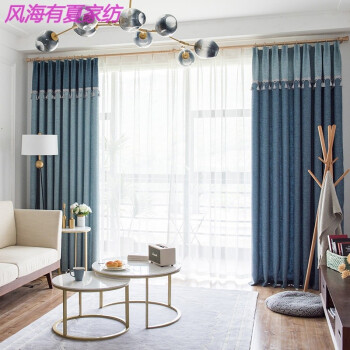 Fenghai has summer curtain Nordic cotton hemp stitching bay window bedroom living room blackout cloth sunshade flax floor standing ready made simple modern summer blue stitching 1 width 3.0 x height 2.7 hook type / piece [can change short hook] [pict...
